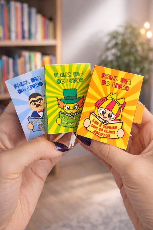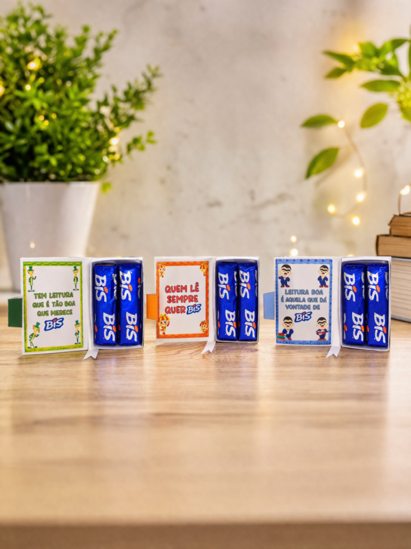💡 Cada modelo possui uma frase diferente na “capa” do livrinho, com trocadilhos criativos envolvendo leitura 📖 e BIS 🍫