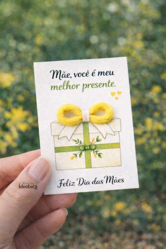 Uma lembrancinha delicada e cheia de significado para o Dia das Mães! O cartão traz a frase *“Mãe, você é meu melhor presente. Feliz Dia das Mães”*, com uma ilustração suave de presente em tons inspirados no girassol, perfeita para compor com uma xuxinha na parte frontal.