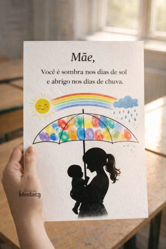 As crianças carimbam as mãos formando um guarda-chuva colorido no painel coletivo e também completam a atividade individual com carimbo de dedos, criando uma homenagem linda e personalizada.